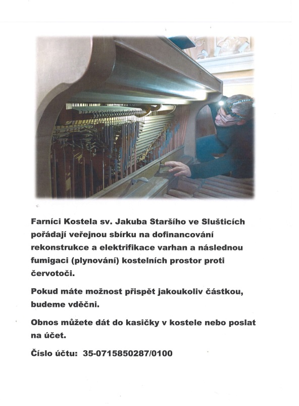 Veřejná sbírka - rekonstrukce varhanů v kostele sv. Jakuba Staršího ve Sluštících