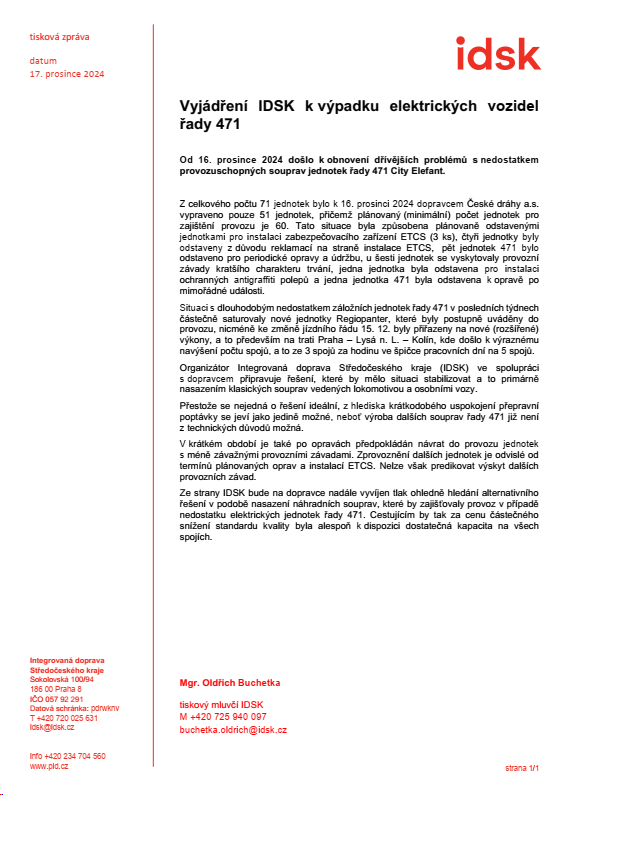 Vyjádření IDSK k výpadku elektrických vozidel řady 471