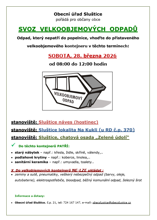 Svoz velkoobjemového odpadu v obci proběhne v sobotu 28.3.2026